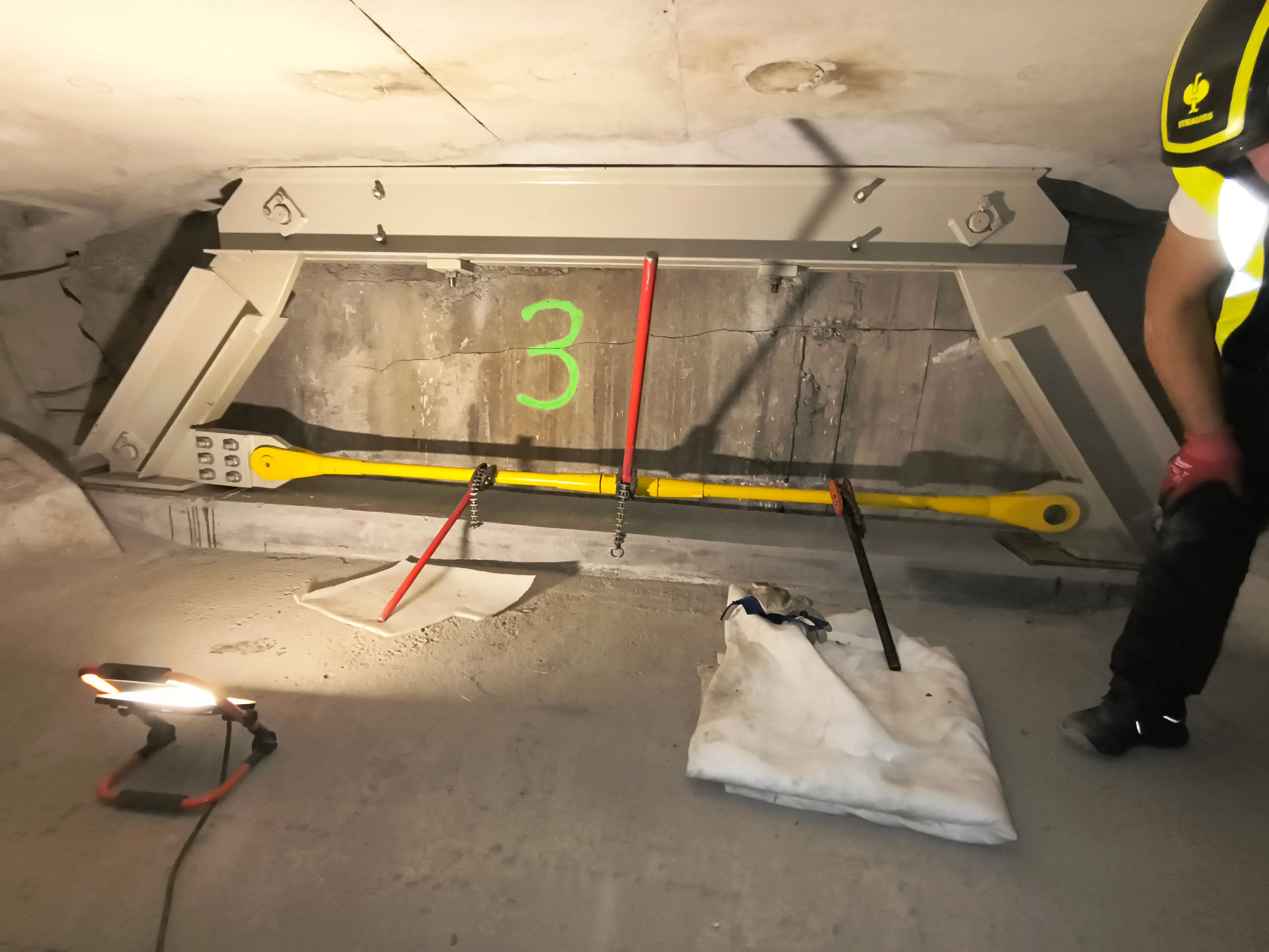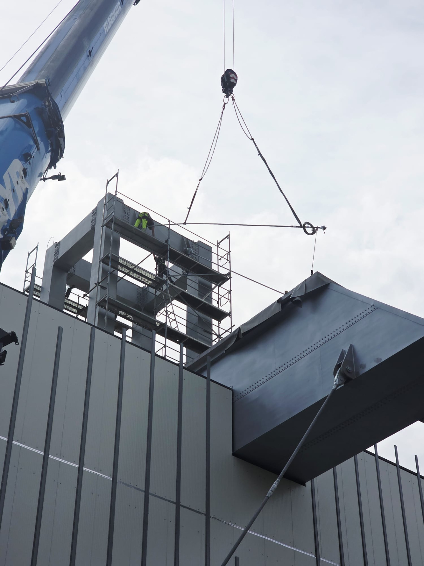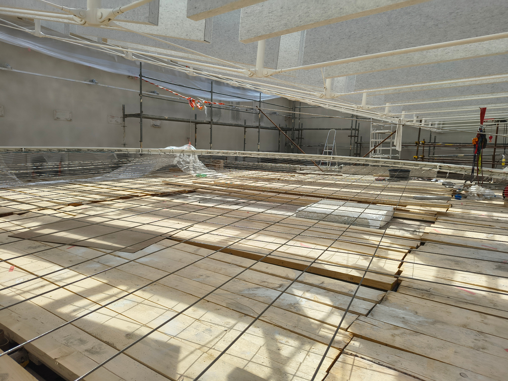 Montáž, aktivace a předepnutí ocelových táhel vynášejících železobetonovou střechu.